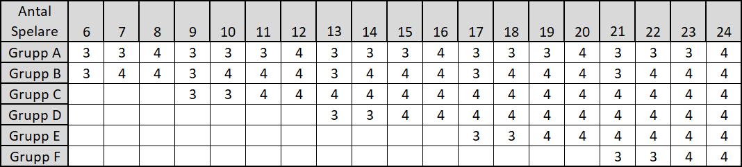 Såhär delas spelarna in i fall av spelare från 6st till 24st:
